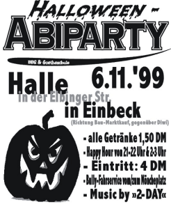 feiert!" Dass in diesem Ausspruch sehr viel Wahrheit liegt konnten alle Besucher der Halloween-Abiparty am 6.November 1999 höchstpersönlich feststellen. In der Elbinger Straße wurde dem urspünglich irischen "AllHallows Evening" (kurz Halloween) mit allerlei "schrecklicher" Dekoration alle Ehre gemacht. Für die gute, abwechslungsreiche Musik bis in die frühen Morgenstunden sorgte 2-DAY. |